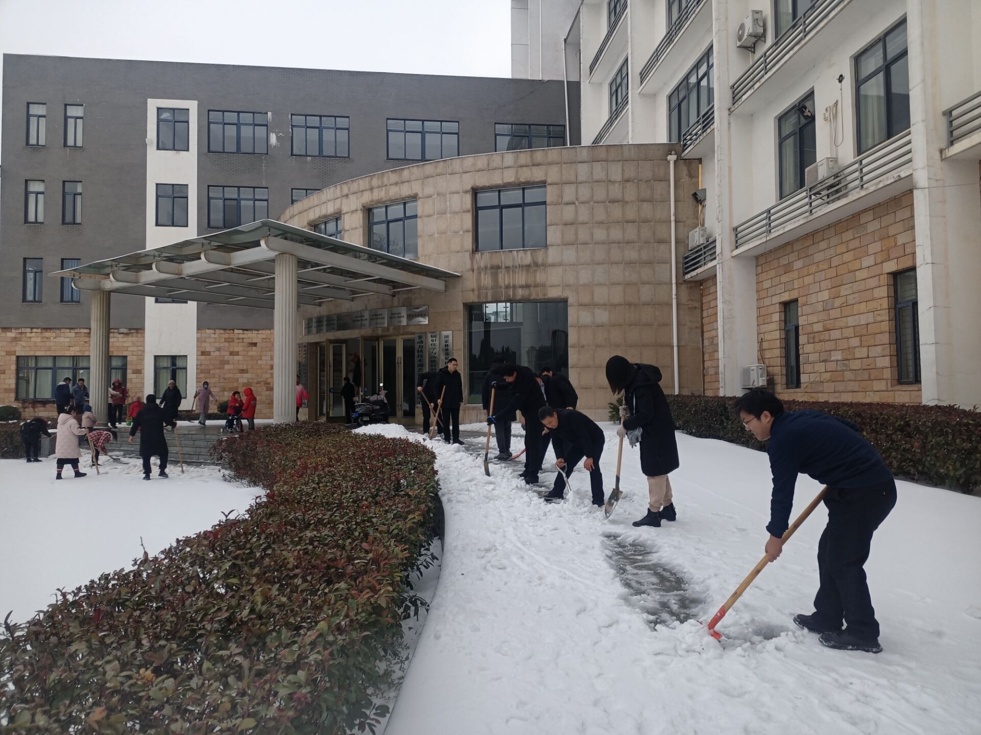3点开始,在核化生院党委书记陈志远、院长范宝磊等领导带领下,大家手拿铁锨、扫帚、锄头等工具,顶寒风、冒严寒,奋力铲除路面冰雪,老师们齐心㔹力、干劲十足,又说有笑,一派热火朝天的景象,忙碌的身影构成了一道亮丽的校园风景线。经过近2小时的努力,铲开了一条从核化生院楼前到主干道的道路。