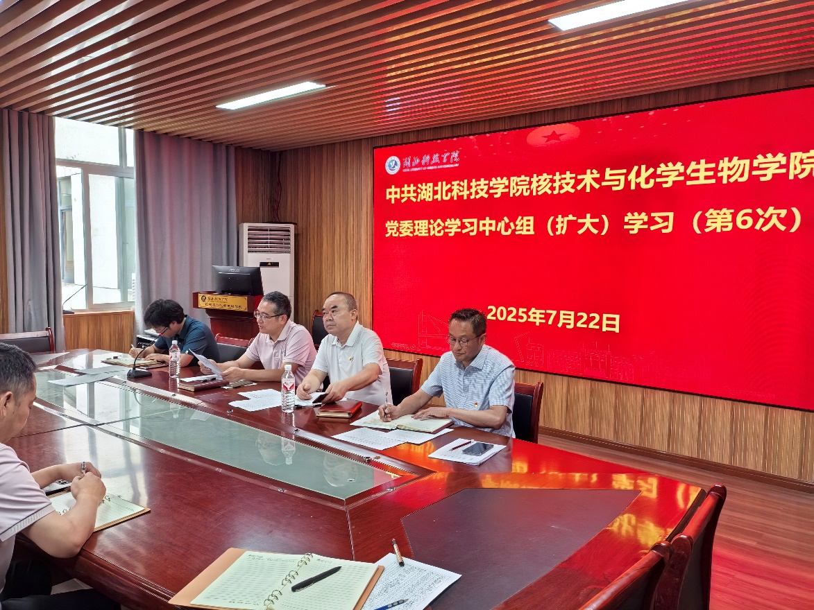 (作者:熊厚华,审稿:张规富)2025 年 7 月 22 日上午 9:30,核化生学院党委理论学习中心组(扩大)学习(2025年第 6 次)暨全体党员学习教育在核化生学院二楼会议室 F201 举行。会议主题是深入贯彻中央八项规定精神学习教育,会议由党委书记张规富主持,学院领导班子成员张规富、朱晓明、彭胜国、谢聪以及核化生学院全体党员参与。