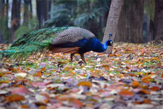 动物园的孔雀基本属于放养节奏,在白犀的笼区和草坪上随意觅食,十分惬意。