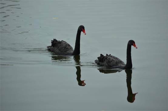 黑天鹅与桥对岸的火烈鸟交相呼应,交织成一道亮丽的风景。