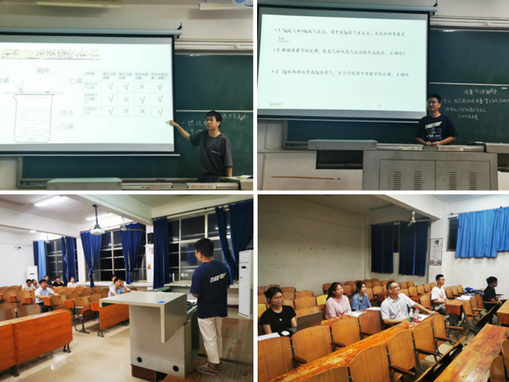 指导教师分别从课堂教学(教学目的、教学内容、教学方法、教学过程、教学素质、教学效果、教学创新);板书设计(内容、构图、书写);多媒体制作(技术性、艺术性)三个方面对学生的试讲进行指导和评分。因培养方案的变更,1819级化学专业同时开展校内试讲工作,学生人数增加,指导教师工作量非常大。指导教师利用课余时间,加班加点,反复打磨学生师范技能。通过多次试讲,学生师范技能显著提升,为顺利走上讲台打下了扎实的基础。