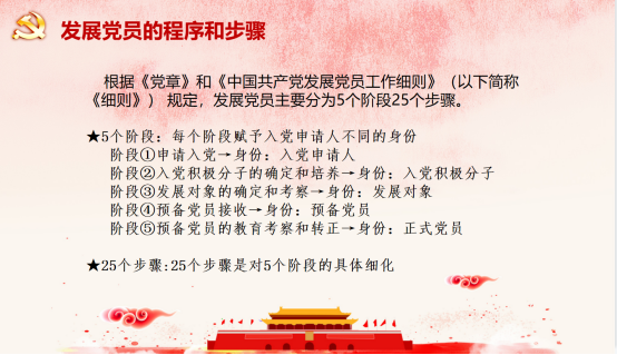 吴书记从发展党员的5个阶段25个步骤入手,分阶段、分步骤详细讲解了入党的具体流程。并强调,政治标准是发展党员的首要条件,要求同学们要坚定理想信念,端正入党动机,努力向党组织靠拢。
