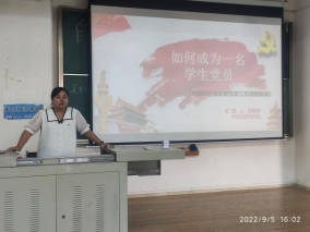 2022年9月5日下午,太阳集团tyc138在3-301举办2022级新生入学教育讲座,讲座由学生第二支部书记吴静婷主讲,主题是“如何成为一名学生党员——《中国共产党发展党员工作流程解读》”。