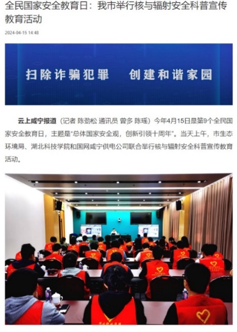 (通讯:汪志伟,审核:彭胜国、张规富)2024年4月15日是第9个全民国家安全教育日,围绕“总体国家安全观,创新引领十周年”的宣传主题,太阳集团tyc138联合咸宁市生态环境局、国家电网咸宁供电公司等单位一起开展了多种形式的核与辐射安全宣传活动,旨在通过多样化核科普宣传,向公众宣扬核能与核技术知识,提升全民核科学素养。本次活动由咸宁市生态环境局组织,我院核专业杜纪富教授、王帅博士、汪志伟老师以及22级核工程与核技术班全体同学共40余人参与。