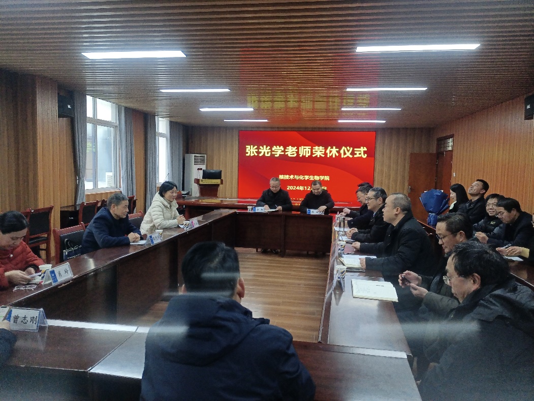 (通讯员:孙锐、熊厚华,审核:彭胜国,张规富)为了表彰核化生学院张光学老师对学院作出的贡献,同时激励青年教师积极成长、追求卓越,20241231日,核化生学院为张光学老师举办了荣休活动,学院领导班子成员、学校工会副主席汪虹、离退休工作处副处长肖玲、国资处处长毛晔、学工处副处长徐杨、教务处副处长曾志刚、团委副书记陈涛、校友办余光强老师及核化生学院教师代表参加了此次荣休活动。