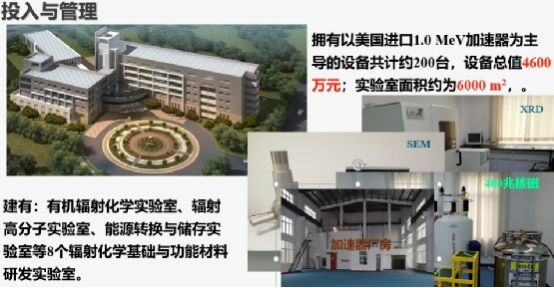 依托“辐射化学与功能材料湖北省重点实验室”、“非动力核技术湖北省重点产业化创新团队”、“材料辐射改性湖北省工程实验室”、“材料辐射改性技术国家地方联合工程实验室”、“非动力核技术湖北省协同创新中心”等科研平台,组建有“能原材料辐射改性”、“智能水凝胶”、“高选择性吸附材料合成及应用”、“功能材料开发及应用”、“有机小分子催化及其在药物开发中的应用”等科研及产业化团队。科研实验室面积总计 6000 余平方米,仪器设备总值约 4700 万元。